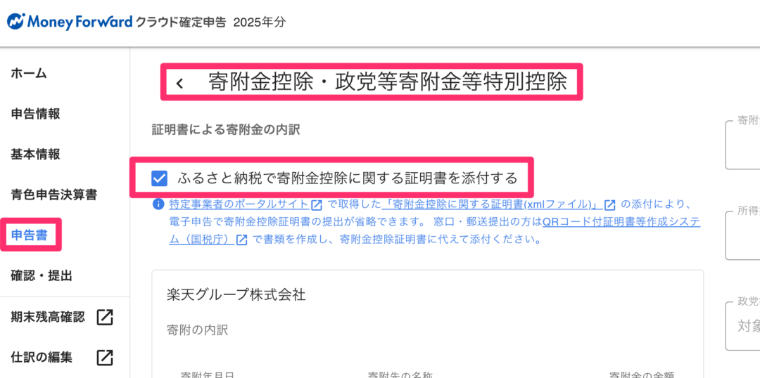 メニューの「申告書 > 寄附金控除」にアクセスし、「ふるさと納税で寄附金控除に関する証明書を添付する」にチェックを入れます。
